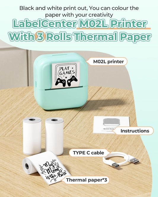 LabelCenter Mini Drucker M02L,Sticker drucker, Mini drucker für Smartphone, Sticker Drucker, Mini Fotodrucker,Sticker Drucker Mini Printer für Fotos, Notizen, Memo, mit 3 Rollen Papier, Grün