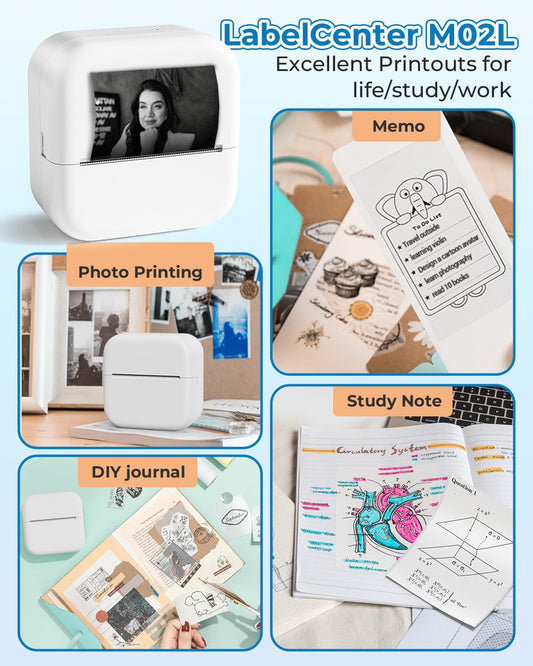 LabelCenter Mini Printer,Mini Thermal Printer M02L Portable Mini Printer, Portable Photo Printer Sticker Printer Portable Printer for Study,Photo,Notes,Compatible with Phone Tablet,White