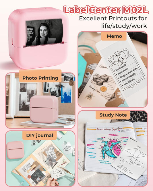 LabelCenter Mini Imprimante Portable M02L, Mini Autocollant Imprimante Mini Photo Imprimante,Imprimante Photo Portable,Imprimante Autocollant pour Téléphone,Compatible avec Phone et Tablette,Rose