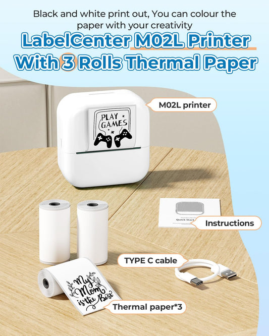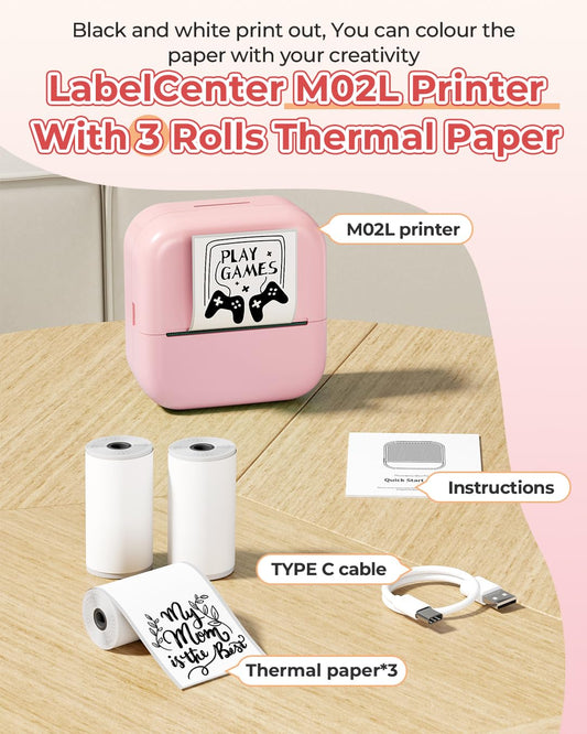 LabelCenter Sticker Drucker Mini Drucker für Smartphone Mini Sticker Drucker M02L,Sticker Drucker Mini Drucker Aufkleber,Taschendrucker für Studium, Notizen, Journal, Fotos, mit 1 Rollen Papier