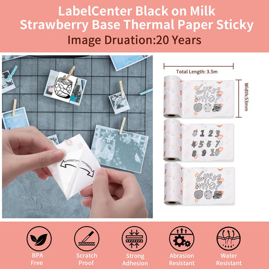 T02 Aufkleberpapier,T02/M02X/M02L Mini Drucker Papier Aufkleber, T02 papier Milch Erdbeere, Mini Sticker Drucker Papier für selbstklebendes Aufkleber Papier, für Journal Fototexte,3 Rollen