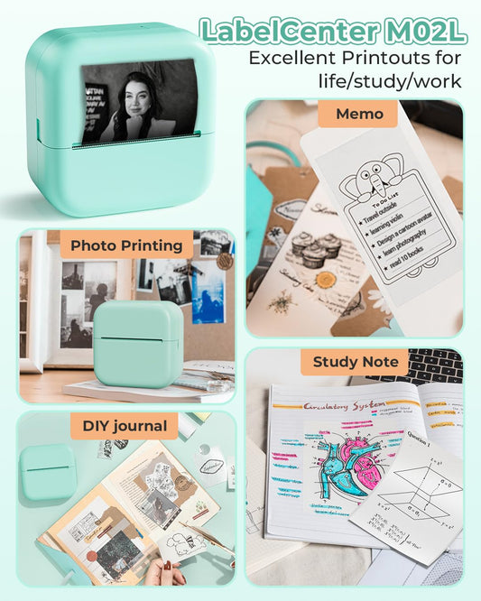 Mini Printer Mini Sticker Printer,Mini Printer M02L Photo printer,Portable Pocket Printer, Mini Printer for Iphone,Mini Photo Printer for Photo,Notes,Study,Green